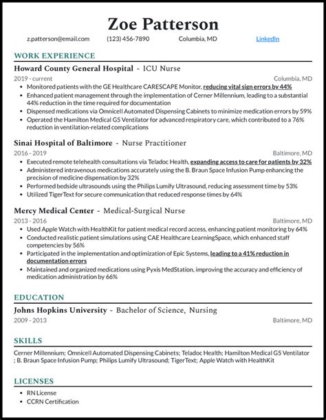 • Education and Certifications: Clear listing of your nursing degree and specialized critical care credentials.