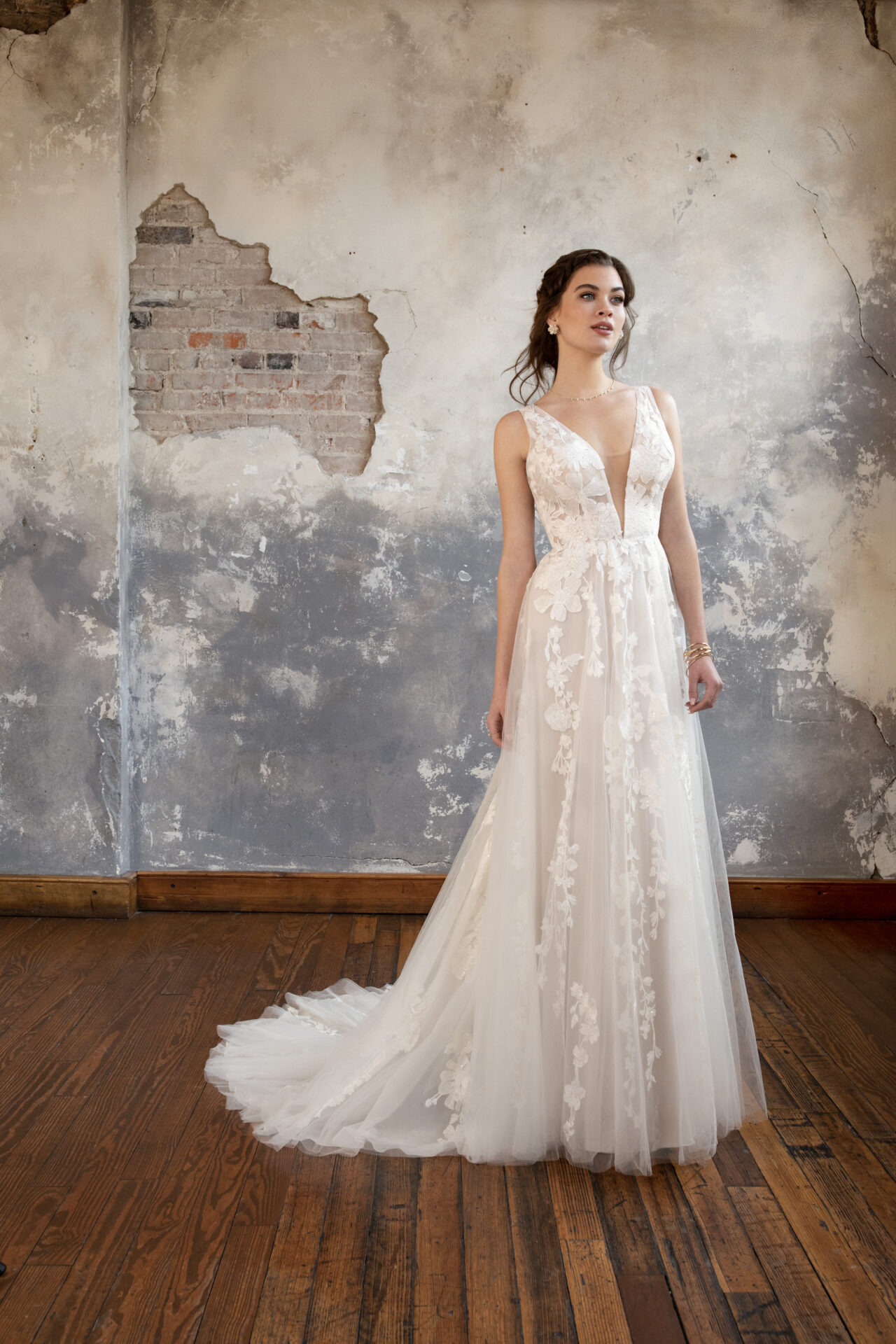 • Veils: A cathedral-length veil with simple lace edges perfectly complements the bohemian vibe of the Saylor style.